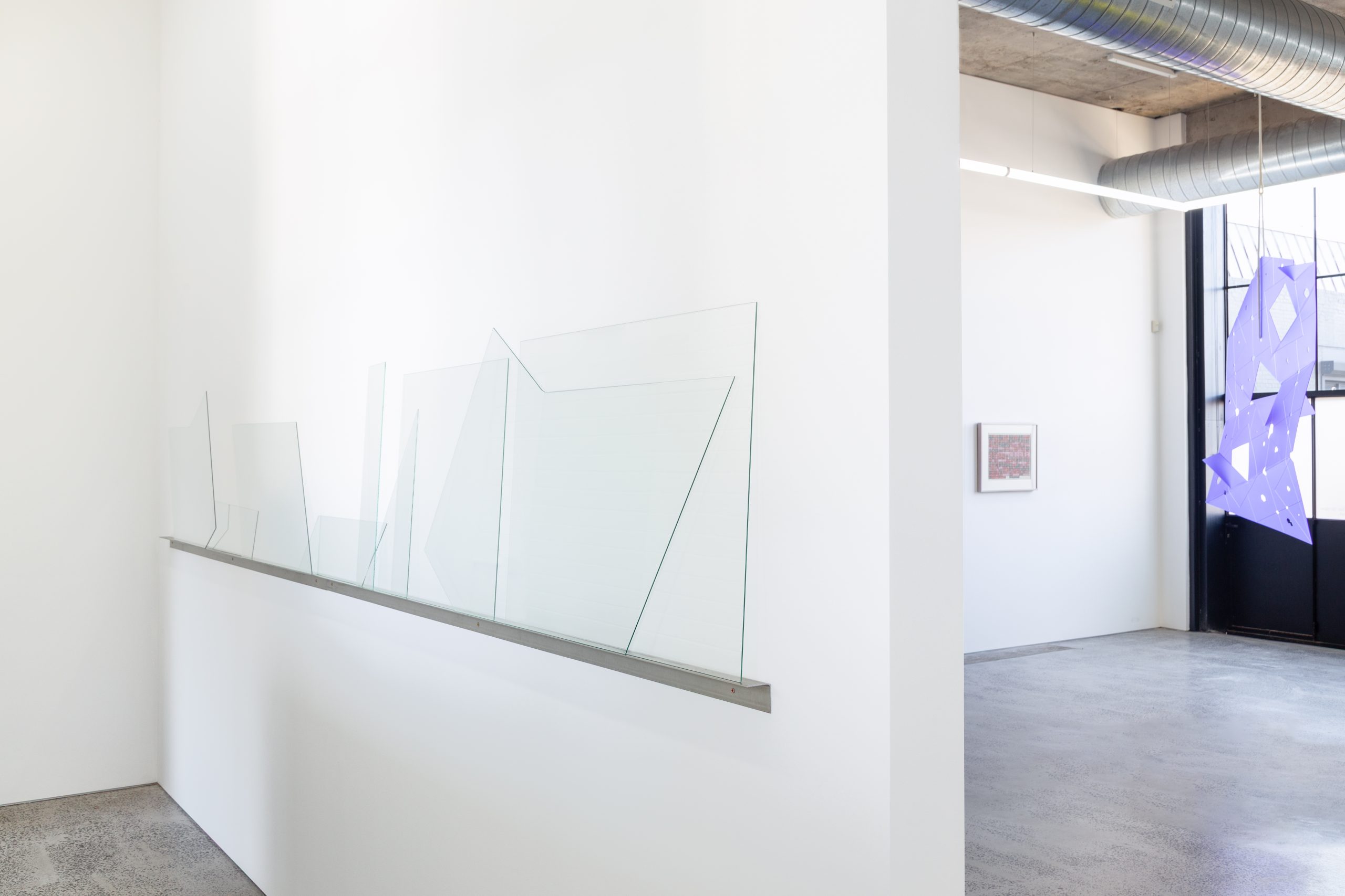 Ebony Maurice-Wilmott, Shaped Glass 2024, cut glass on metal shelf, 440 x 70 cm